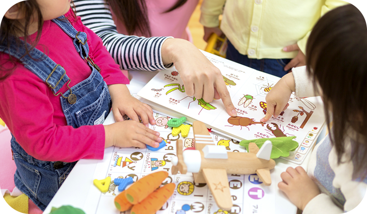通常の保育終了後に、通い慣れた園内で、いつものお友達と楽しく学んで頂きます。経験豊かな外国人講師と、日本人アシスタントのチームティーチングを行う事により、外国人講師は英語のレッスンに専念する事ができ、充実したレッスンをご提供出来ます。